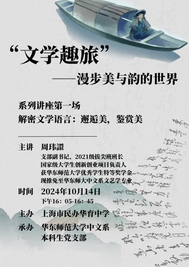 10月14日下午,中文系本科生党支部副书记、2021级元化班班长周玮譞为华育中学海日文学社带来主题为“解密文学语言:邂逅美,鉴赏美”的文学讲座。