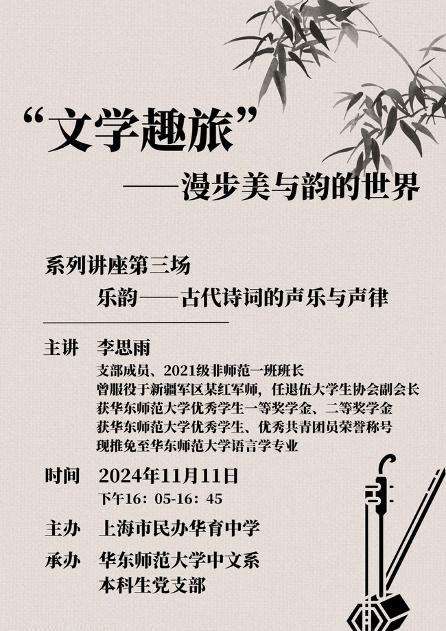 11月11日下午,中文系本科生党支部学生党员、2021级非师范李思雨为华育中学海日文学社带来主题为“乐韵:古代诗词的声乐与声律”的文学讲座。