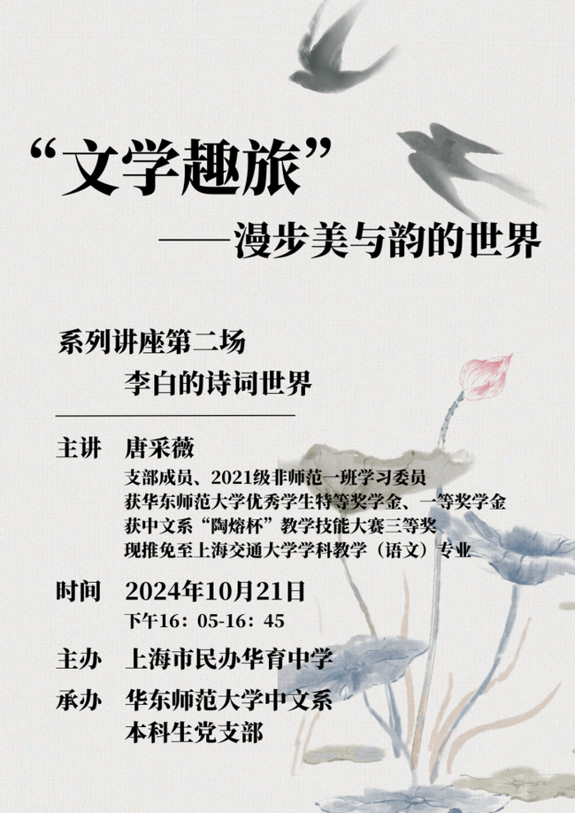 10月21日下午,中文系本科生党支部学生党员、2021级非师范唐采薇为华育中学海日文学社带来主题为“李白的诗词世界”的文学讲座。