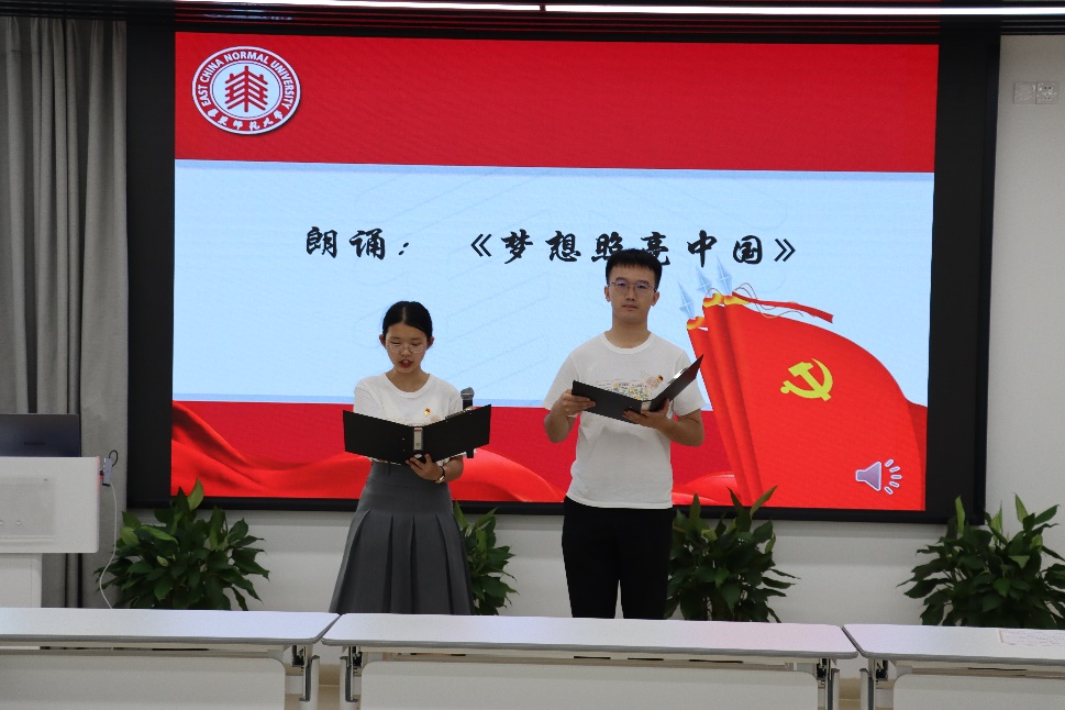 中文系2019级本科生吕宁、宋睿琳共同朗诵了《梦想照亮中国》,献礼中国共产党成立102周年,激励与会同志不懈奋斗。