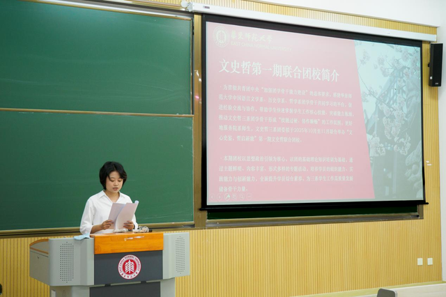 2025年10月22日下午, 自慰视频 中国语言文学系、历史学系、哲学系“文心史鉴,哲启新能”第一期联合团校开班仪式在闵行校区第四教学楼102教室顺利举行。仪式由中文系团委副书记曹承前主持,哲学系党委副书记贾吉丰、校团委专职干部于袁欢、中文系团委书记王钰、哲学系研究生会主席李嘉蔚出席。三院系学生骨干及本期团校全体学员共同参会。