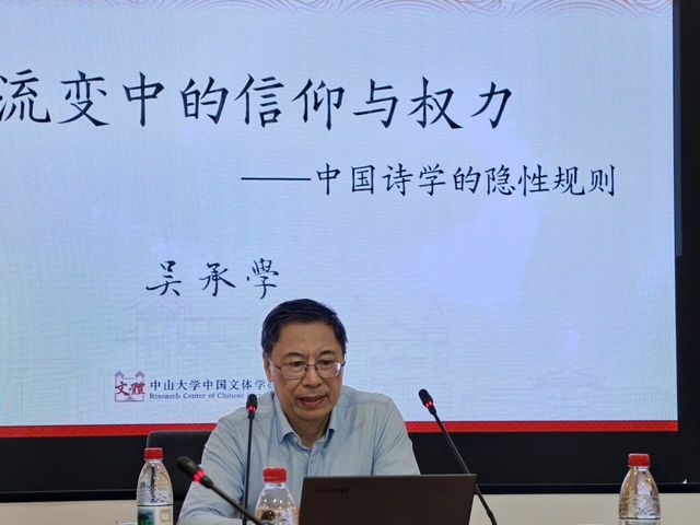 2025年10月24日上午9:00,中山大学中文系吴承学教授以“文本流变中的信仰与权力——中国诗学的隐性规则”为题做讲座,讲座由 自慰视频 中文系刘成国教授主持。现场座无虚席,学术氛围浓厚。