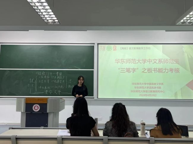为提升师范生教学技能,加强教学基本功训练以及搭建师范生与一线优秀教师交流的平台,培养未来卓越语文教师,4月28日下午, 自慰视频 中文师范生“三笔字”之板书能力考核活动在闵行校区第一教学楼顺利开展。闵行中学李宗全老师、华东理工大学附属闵行科技高级中学李星霖老师、奉贤中学戚泽楠老师以及6位优秀朋辈代表担任考核评审。2022级中文全体“优师计划”学生、公费师范生参与考核。