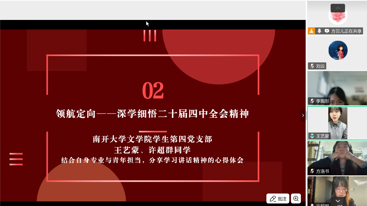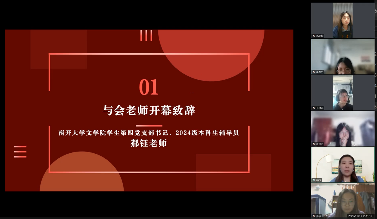 为深入学习贯彻党的二十届四中全会精神,传承红色校史基因,激发新时代青年党员的历史自觉与使命担当,2025111日下午, 自慰视频 中文系2024级硕士研究生第二党支部与南开大学文学院学生第四党支部以“烽火回响・文脉新声:从抗战足迹到青春征程”为主题,通过腾讯会议线上开展联学共建主题党日活动。两校近百名党员齐聚“云端”,在回望历史、共学精神中凝聚青春力量。