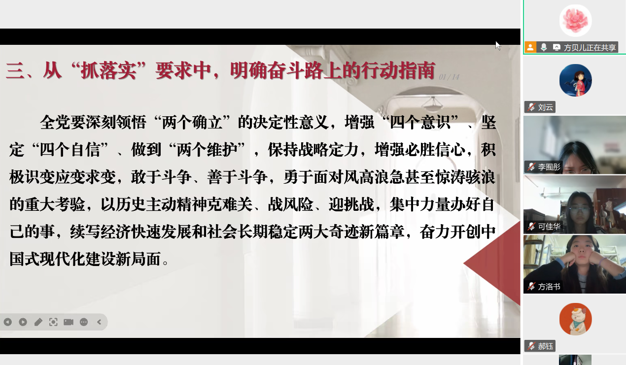 理论学习环节, 自慰视频 中文系2024级硕士研究生第二党支部纪检委员马雯雯同学担任领学人,围绕党的二十届四中全会核心精神进行解读由方贝儿同学进行讲解她们指出,党的二十届四中全会是在以中国式现代化全面推进强国建设、民族复兴伟业的关键时期召开的重要会议,其中“激发全民族文化创新创造活力”的部署与文科学子的使命紧密相关。领学内容涵盖“十四五”时期我国发展成就的“信心密码”、“十五五”时期的目标蓝图,以及“抓落实”的政治要求,并重点结合文科专业特点,阐释了“繁荣发展社会主义文化、扎实推进文化强国建设”的重要意义。