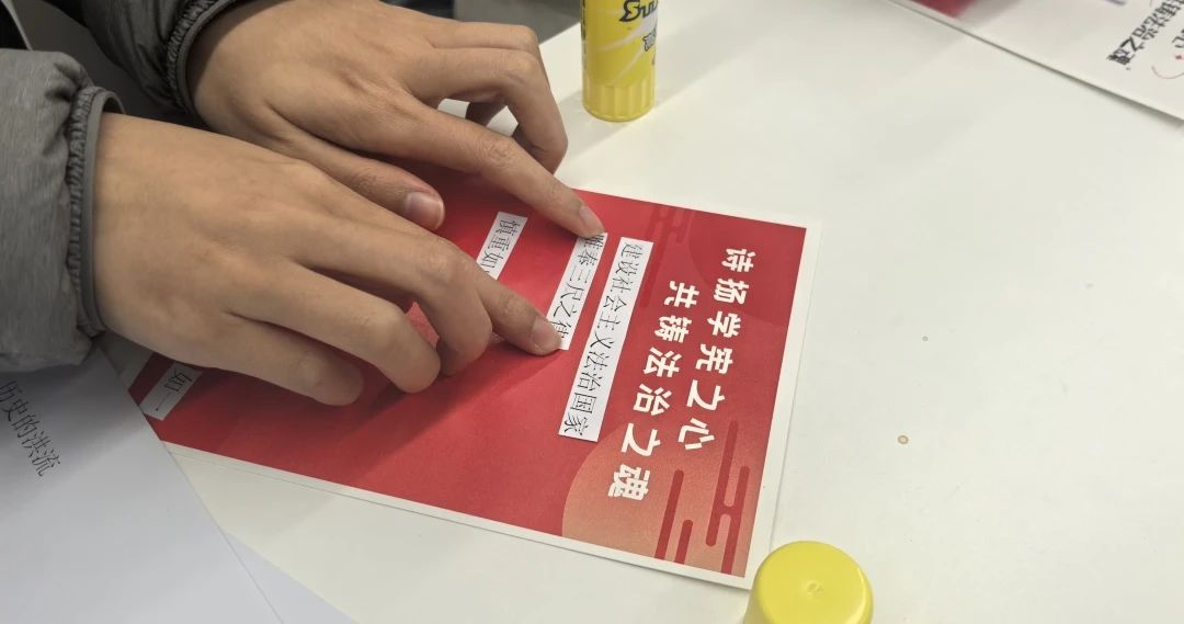 法意文辞笺上载,彩板明辉案前呈。为厚植法治信仰,增强法治意识,12月23日下午,“诗扬学宪之心,共铸法治之魂”主题活动在中文系4430室举行。2024级中文系硕士班多位同学共同参与,通过观看宪法宣传影片、创作宪法拼贴诗,领悟宪法精神,感悟宪法力量。