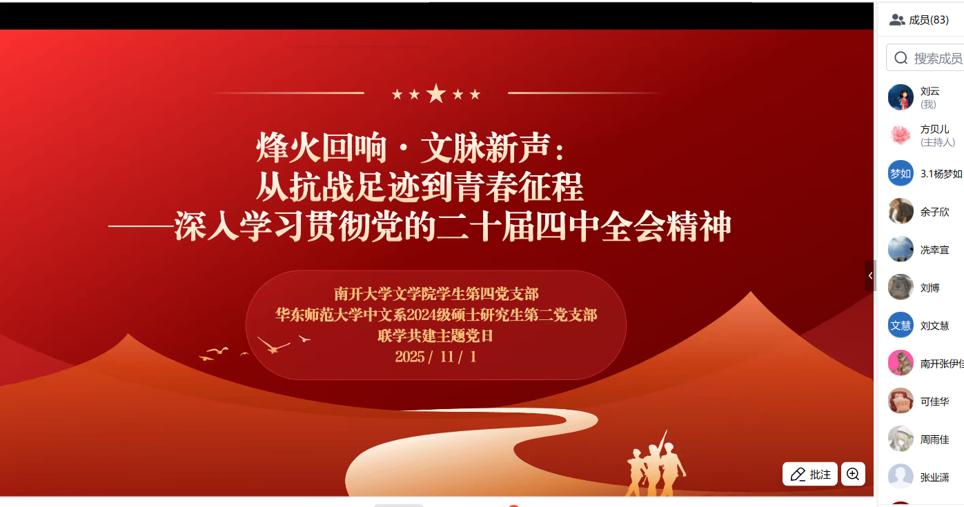 为深入学习贯彻党的二十届四中全会精神,传承红色校史基因,激发新时代青年党员的历史自觉与使命担当,2025111日下午, 自慰视频 中文系2024级硕士研究生第二党支部与南开大学文学院学生第四党支部以“烽火回响・文脉新声:从抗战足迹到青春征程”为主题,通过腾讯会议线上开展联学共建主题党日活动。两校近百名党员齐聚“云端”,在回望历史、共学精神中凝聚青春力量。