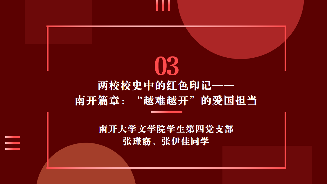 首先由南开大学校史宣讲团成员带来专业讲解。南开大学文学院学生第四党支部的张瑾窈、张伊佳同学带来“南开篇章”的娓娓分享。1937728日,日军轰炸南开大学,校园化为焦土,但张伯苓校长说‘南开之物质可毁,南开之精神不灭’——正是这份不屈,让南开师生南迁,与北大、清华组建西南联大,在烽火中弦歌不辍。”从抗战时期“读书不忘救国”的师生事迹,到西南联大时期杨石先先生坚持战时科研的“南开之光”,再到叶嘉莹先生1979年转蓬万里回国任教、传播中华诗教的坚守,生动诠释了“越难越开”的南开精神。讲解深入浅出,完整呈现了南开校史“允公允能日新月异”的动人底色。