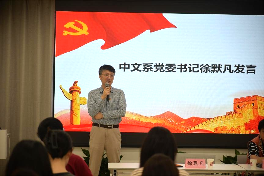 徐默凡以师长的身份向毕业生党员进行经验分享、发表亲切感言。他着重强调了同理心、移情力的重要性,勉励毕业生党员在未来的岗位上应具备换位思考的能力。他根据自身多年的教学工作经验,结合中文学科的实际,提醒同学们要注重“学情”,无论是在人际交往、工作实践还是文学创作中,都要时刻从他人的角度出发,理解并满足他人的期待,以此不断提升党员的奉献精神和服务意识。他希望大家要进一步强化遵守纪律的政治自觉、思想自觉和行动自觉,争做“有理想、敢担当、能吃苦、肯奋斗”的新时代好青年。