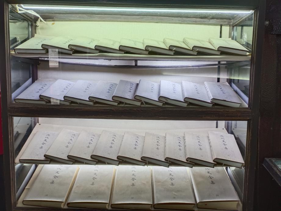 没走几步就到了故居门口。我们按照从左往右的顺序进行参观,整个儿屋子是木质结构,外边是深咖啡色,屋内的墙壁为灰色,不平的地板昭示着这幢房子确实有不少年头。屋内沿着墙壁放着玻璃陈列柜,里边摆放着先生各个时期、不同版本的作品,墙上挂着先生不同阶段的照片,照片底下配有解说。