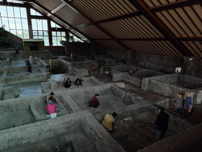 最后,同学们还参观了广富林考古遗址展示馆,其建筑外观形似半埋在土里的陶罐,造型独特。馆内正厅是其“镇馆之宝”——第12号房屋遗迹,是少见的史前建筑遗迹,采用了复杂的技术搬迁至馆中展示。另外设有三个独立展厅,展陈了广富林发掘出土的具有代表性的铜器、陶器、石器等文物遗存。展览模式还加入了视频、触摸屏等科技元素,充满现代感和艺术感。同学们从文字和实物中,深刻体悟着上海文化的源远流长。