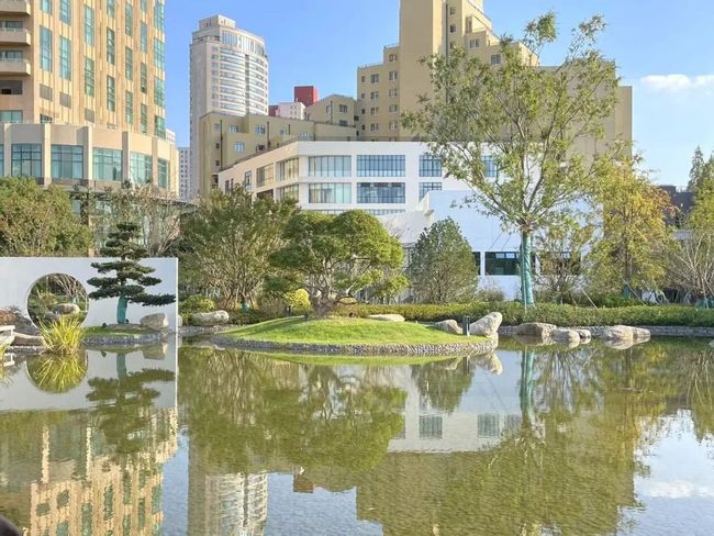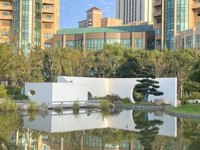出亭过桥,我们踏上小路,向北可“隔水观亭”,向南,园外是衡山宾馆的“山”形建筑,恰构成了“隔水观山”。朱老师这才娓娓道来园林的布局之妙。最初的“古风”建筑是“独坐幽篁里”,是“在山里林子里丢一两个建筑”;而后逐渐形成园林的观赏逻辑,“隔水观山”就是“古典”规律之一。古典的样式也在实践中发展,形成“一河两岸”、“一山三面”、“池岛型”三种现代样式。有趣的是,衡山宾馆楼的设计处处蕴含着西方哥特式的竖线条,却遥遥融进这个中式园林,一竖一横,一山一水,一西一中,相得益彰。行至两侧高树作拟林间的小路的尽头,一转,已是入园前的一片草坪。