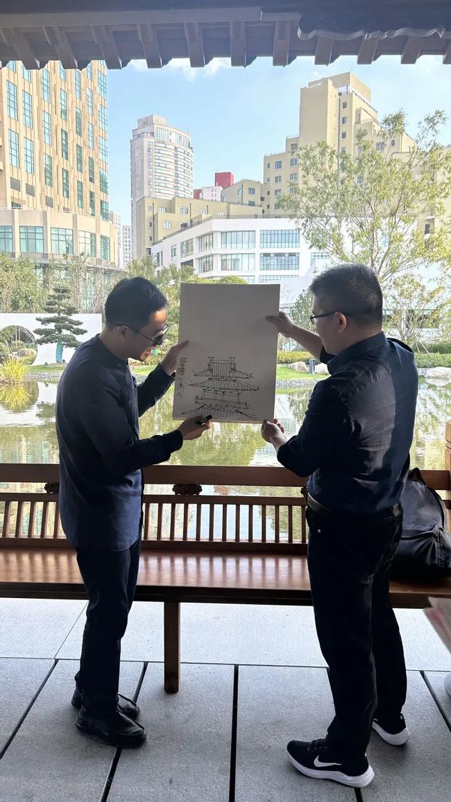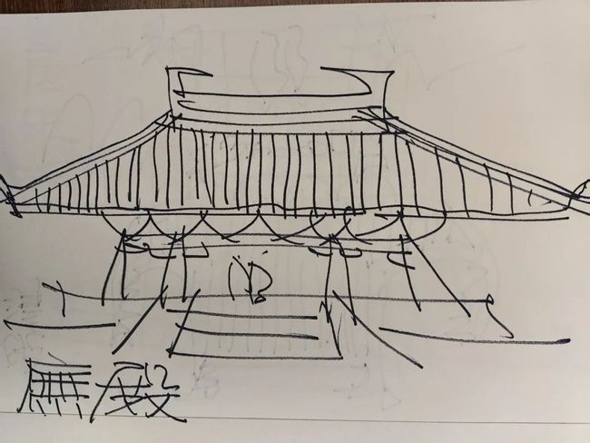 过桥,入亭,我们来到本堂课的重点之一,屋顶。朱老师三笔成屋,五笔成顶,刷刷画出“庑殿顶”“歇山顶”“悬山顶”“攒尖顶”“硬山顶”,再加上“重檐三滴水”。论起来,老师最爱悬山顶,因为它两边有“切断”的力量,而又正是“切断”带来了屋顶向两边无限的延展;次之歇山顶亦是很美,中间是向上天的致意,四角又向远方;重檐则是庑殿顶的“升级”,但正如单眼皮和双眼皮,各有各的韵味。眼下这座亭子,曾险些被设计成晚清流行的“翘角”,那不仅过分娇俏,还因一味向上“翘”而失去了唐宋气韵中极为重要的中国逻辑:亲地性。楼亭虽起,屋顶却是要展开双臂拥向大地。不仅如此,亭子里立柱、长窗的“竖线条”也有讲究,要么尽量疏朗、要么做成细密的一排,都为避免冲突了“横向”这一基本逻辑。朱老师挥手一指,原来整座亭桥南面的沿水处还仔细抠出了一整条细槽,亭桥投上水面的阴影仿佛将之轻轻托起;细槽本身也加强了横向线条顺着水面的流动。