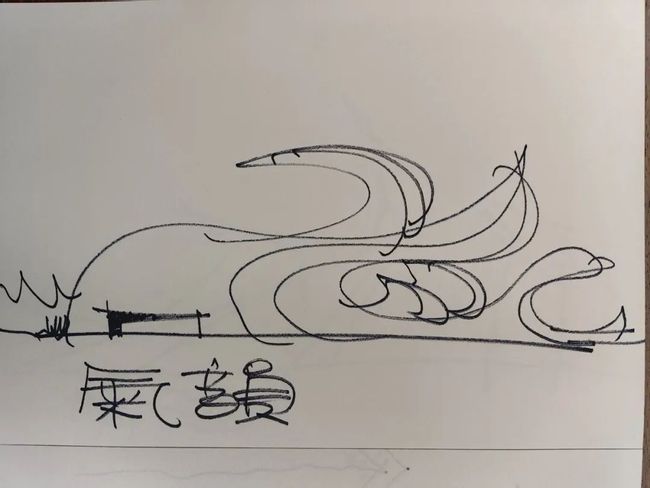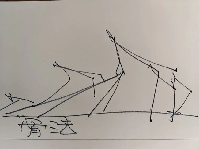 “这是用墙的直线切入自然的曲线,但直的墙也在转折中有曲的流动,就像人的这个眉毛和鼻子”