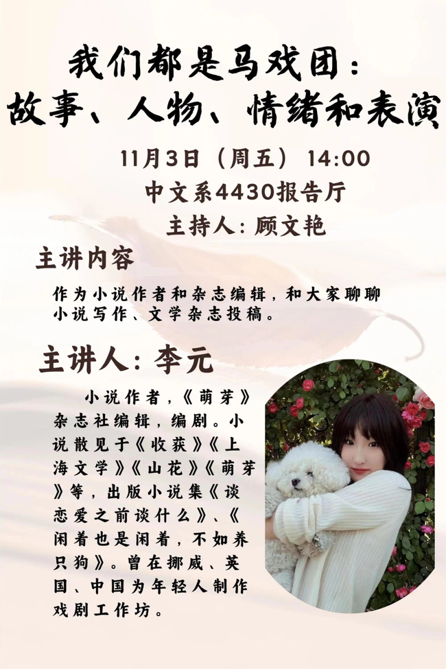 讲座内容回顾:2023年11月3日,《萌芽》杂志社编辑、小说作者兼编剧李元在 自慰视频 中文系开展讲座,主题为“我们都是马戏团:故事、人物、情绪和表演”。讲座由 自慰视频 中文系副教授、2023级创意写作专业青年学者班主任顾文艳主持。