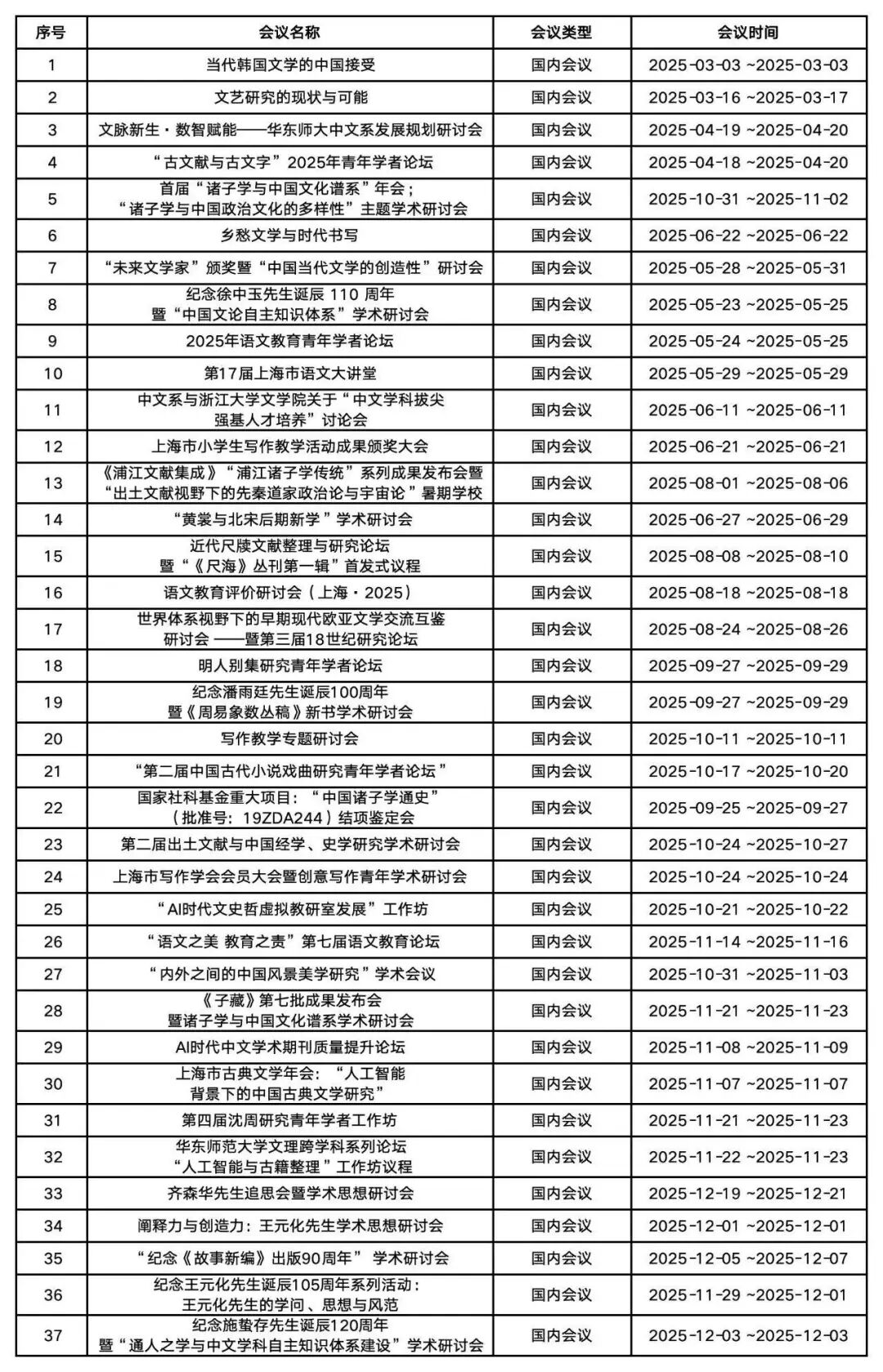 2025年,我系积极搭建高层次学术平台,持续推动学术交流与思想碰撞。在学术交流方面,全年共计举办各类学术会议37场。会议围绕古典文献传承与经史学术创新研究;诸子思想谱系与学术名家思想传承,如施蛰存、徐中玉、王元化、潘雨廷先生系列纪念活动,发布《自主知识体系建设报告》;中外文学融通与文艺理论前沿建构,语文教育革新与中文人才卓越培养等重要研究领域展开。中文系始终以整理国故、赓续文脉为使命,以进一步引领文学与人文研究的全新范式为目标,在学术界内外均产生了广泛而重要的社会影响力。