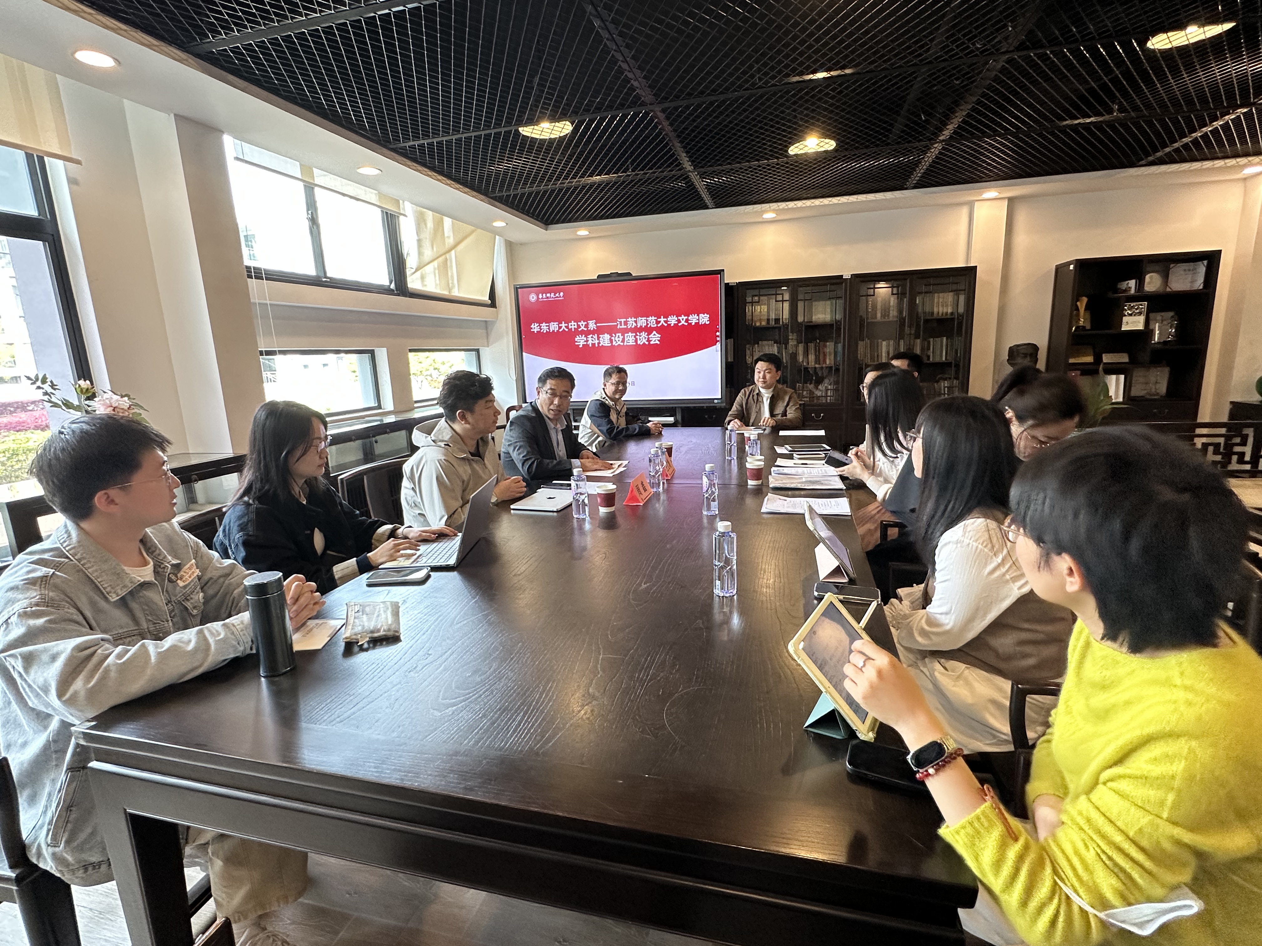 座谈会上,系主任罗岗教授、党委书记徐默凡教授对王立增院长一行表示热烈欢迎,全面介绍了我系的学科底蕴、师资力量、人才培养等方面建设成果。王立增院长介绍了江苏师大文学院的发展概况、学科布局与人才需求,表达了加强院际交流合作的期待。围绕“十五五”规划编制、学科优化与“双一流”建设、师资队伍建设等核心议题,双方分享顶层设计思路与实践经验;面对人工智能发展新趋势,双方重点交流数字人文交叉领域的探索实践,共商人文学科转型与核心价值坚守的融合之道。双方还就博士生“申请-考核制”、培养方案优化、导师队伍建设等话题务实研讨,并就毕业生多元就业引导达成共识。