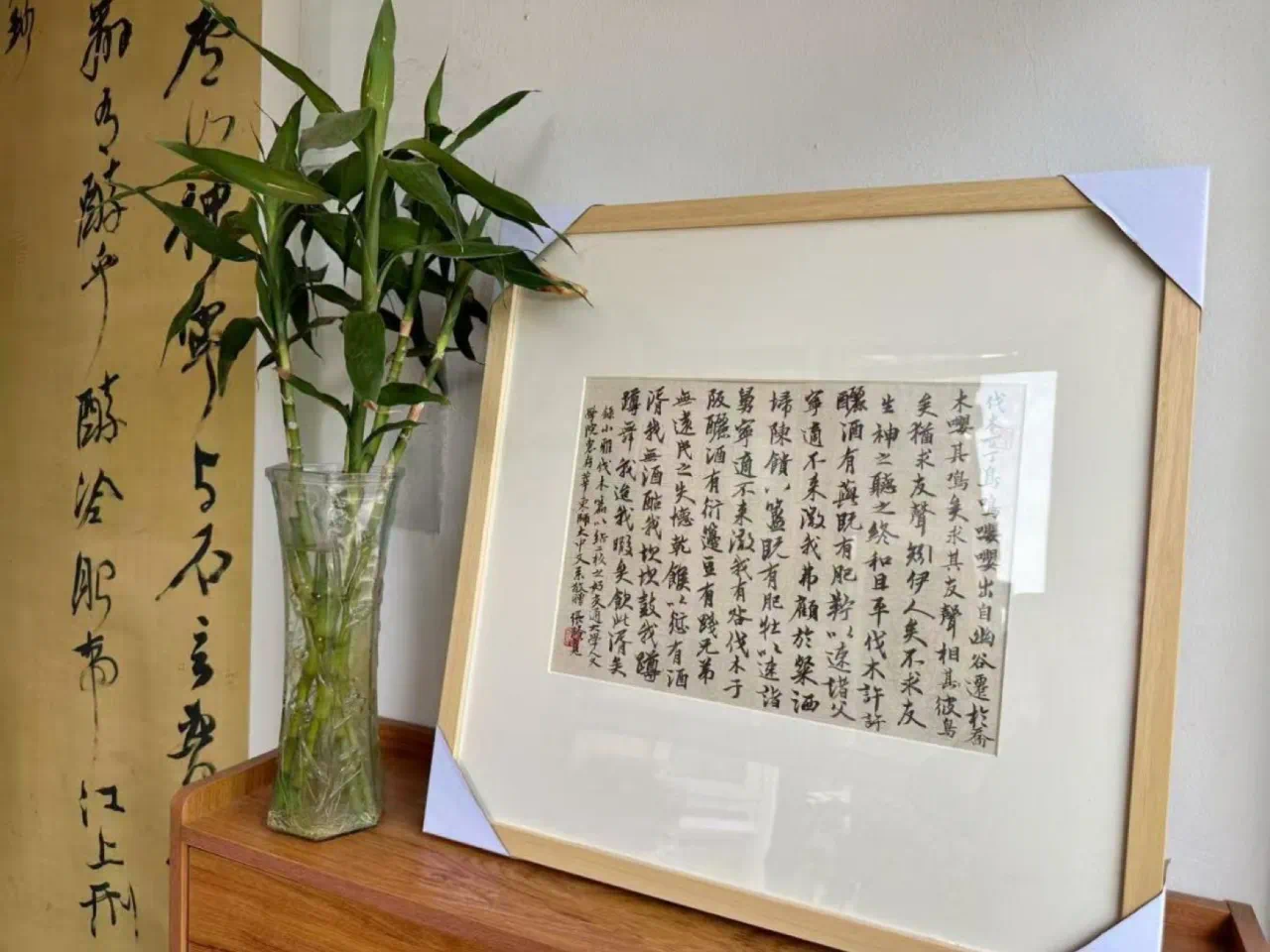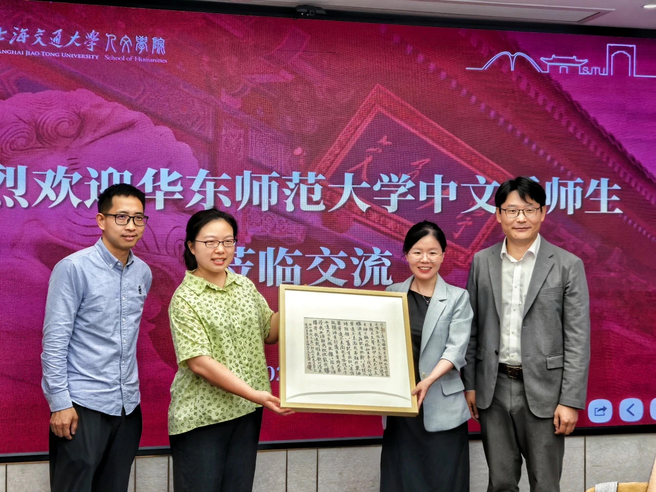 上海交通大学人文学院学工办主任韩红蕊老师,2024级博士班班主任周庆贵老师热情接待了中文系师生一行,并带领参观人文学院图书馆、楼内多媒体“博物馆”、办公区域及教工之家等场所。在随后的座谈交流中,双方师生回顾了两校深厚的学术渊源,并就建立博士生常态化交流机制达成共识,共同展望合作发展的美好前景。张潇萌老师在发言中细数两校渊源,从百年前华东师大前身校大夏、光华与交通大学同城相望,到如今两校的闵行校区一路之隔,樱桃河与思源湖的水脉相连,两校的精神根系始终紧密交织,希望两校博士生常来常往,多多交流。中文系师生还特别送出一幅书法作品,将中文系的美好情谊传递给对方。该作品取自《诗经》中的名篇《小雅·伐木》,由中文系的张路宽同学书就。“嘤其鸣矣,求其友声”,墨韵之间既寄托着对两校以文会友,以友辅仁的深切期许,亦与中文系“小雅”学术沙龙的文化品牌形成和鸣。座谈会上,两院系师生还围绕“筑学风润心田,落实立德树人”开展主题交流,分享育人工作经验,倾听学生心声。