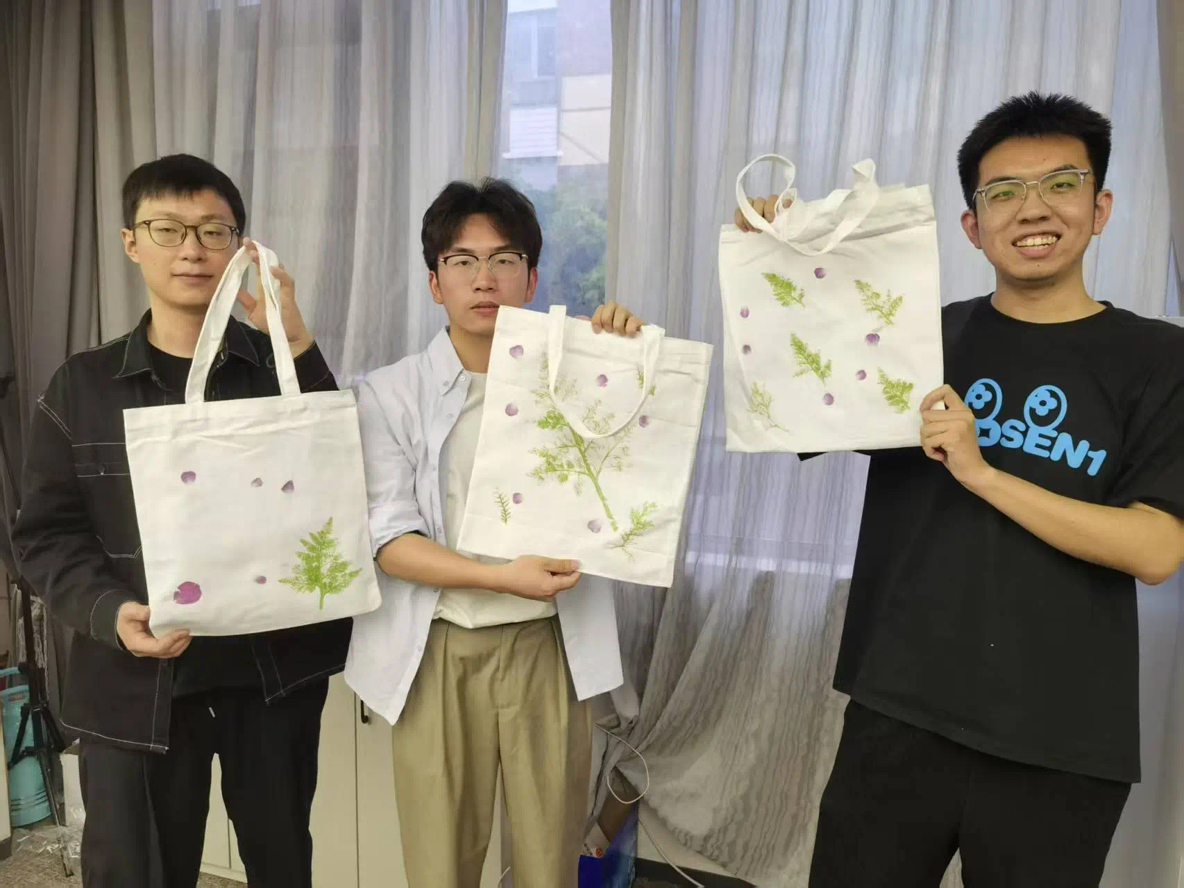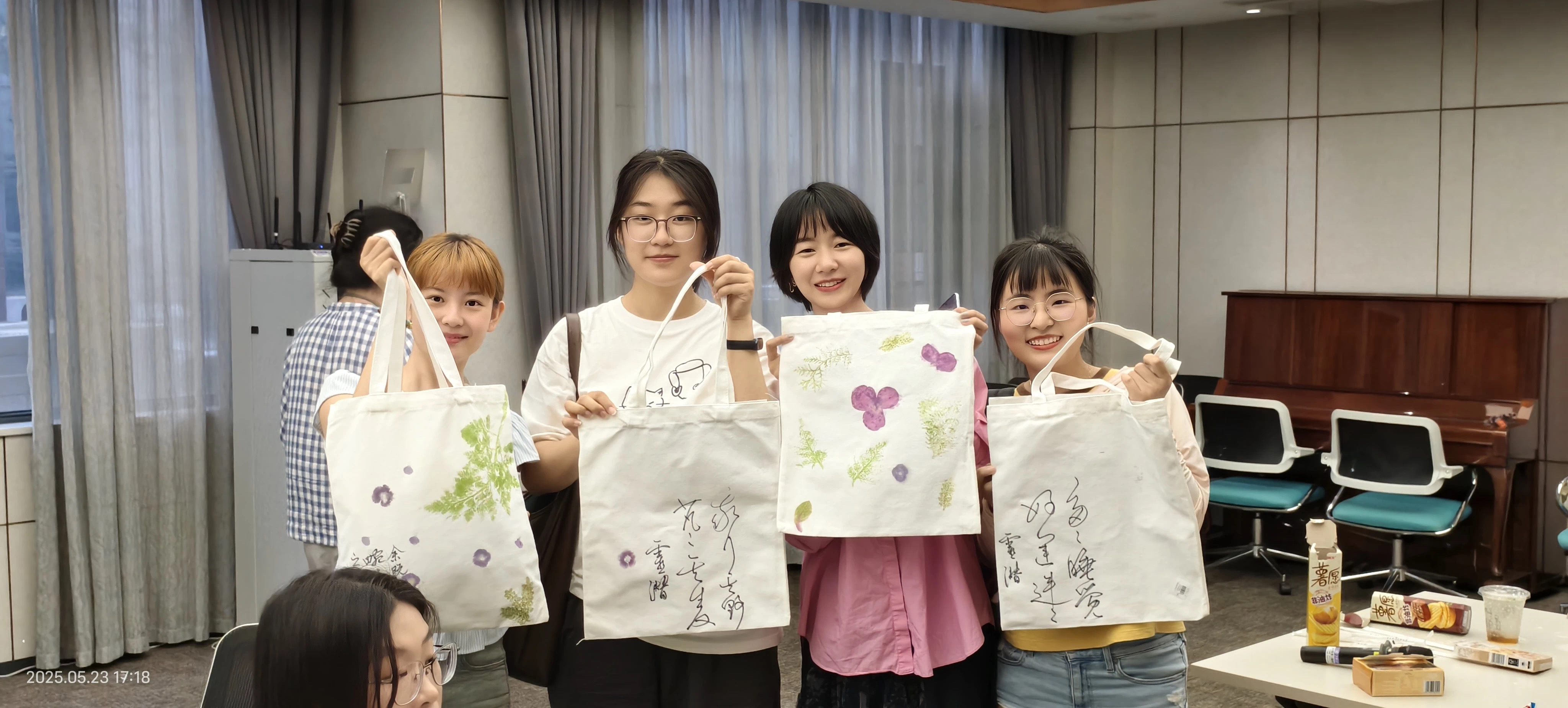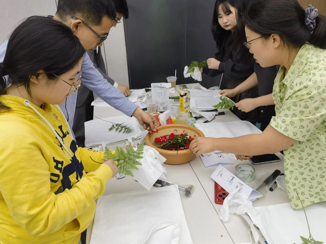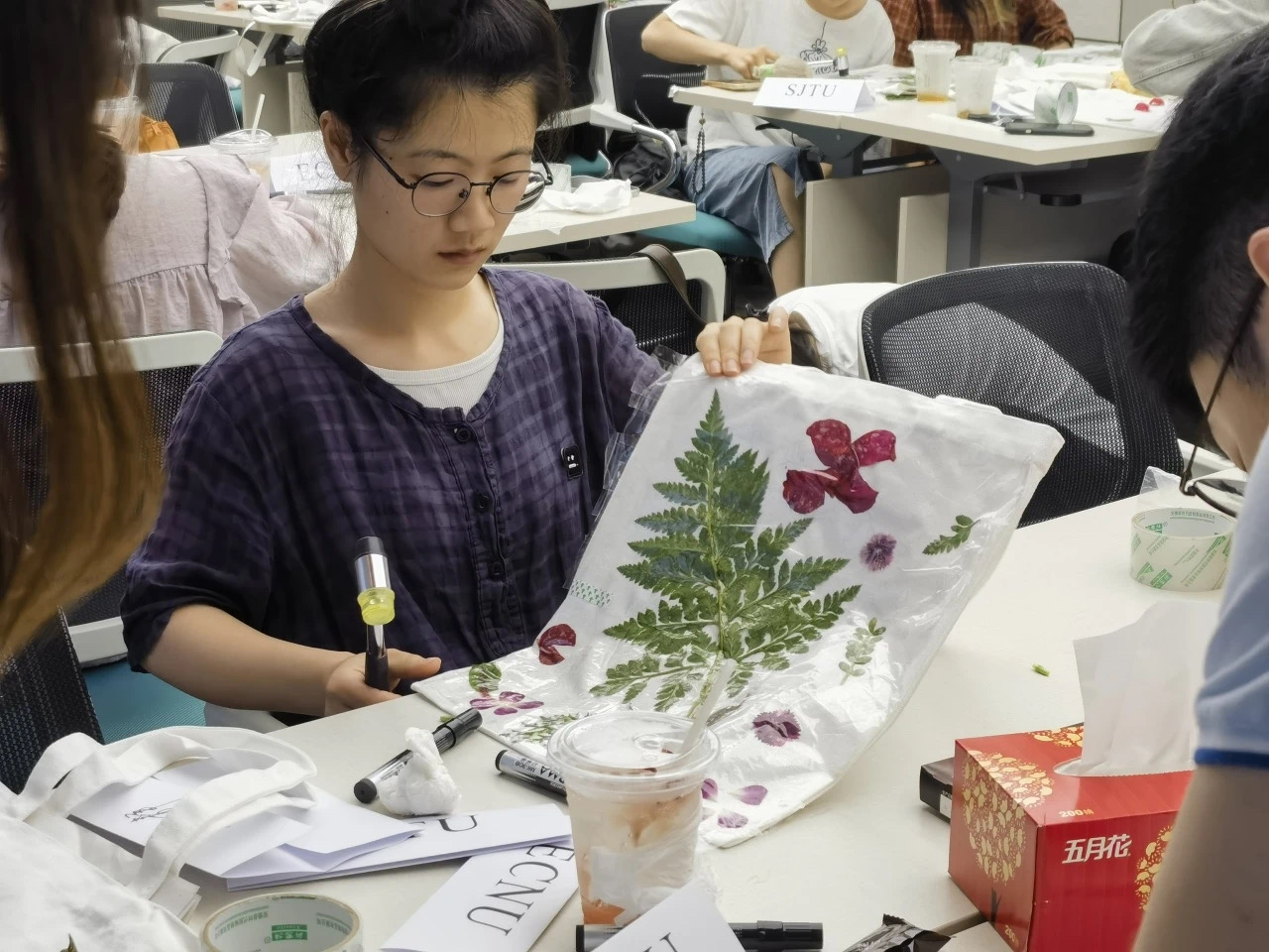 随后,两院系师生还共同体验了帆布包的拓染工艺。同学们选取自己喜欢的花草图案,用胶带把图案固定在空白的帆布包上,随后用小锤敲击图案,使花草的颜色拓染进帆布包。木槌起落间,花瓣与树叶的纹样渐次绽放,整个过程轻松愉快又非常解压,两校同学相互协作,都创作出属于自己的独特作品。