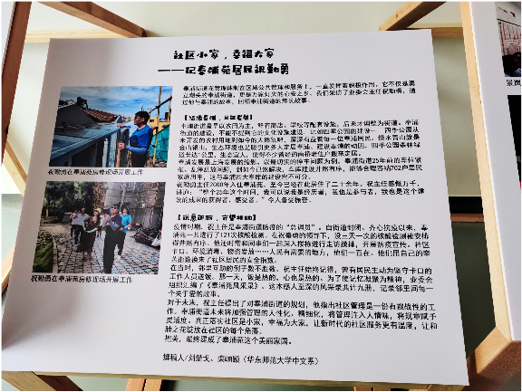 在主题展现场,华东师大中文系本科生党支部副书记胡王璐同志向各位领导和居民们,介绍了中文系党支部参与奉浦苑“社区博物馆”项目的情况: