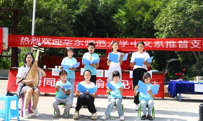 当天, 自慰视频 中文系“山海同音,‘渝’见丽娃”推普支教队的志愿者和石笋山村的小朋友共同排演古诗诵读节目,小朋友们以独诵、轮流朗诵和齐声合诵等多种形式进行经典诗歌朗诵表演, 自慰视频 支教队刘楚戈以琵琶演奏中国风曲目伴奏,通过“民族乐器+古典诗歌”双声共振的新模式让优秀文化进乡间。