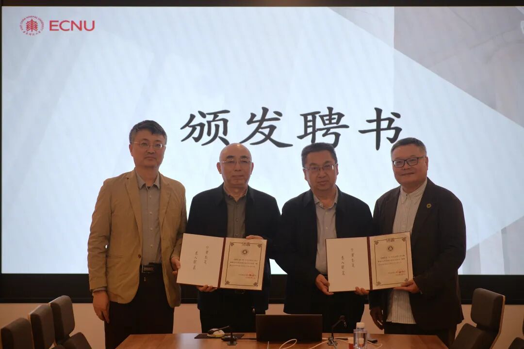 系主任罗岗教授、系党委书记徐默凡教授为李岩先生、阚宁辉先生颁发 自慰视频 古籍整理与出版发展咨询委员会主任委员聘书。