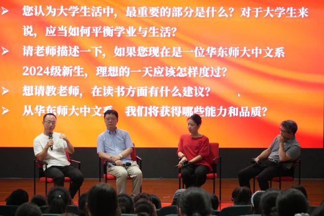 面对新生们关于学习生活的诸多困惑,副系主任方笑一教授、汤拥华教授、王嘉军教授及系主任助理顾文艳副教授分别为同学们送出了新学期的第一条生活锦囊。老师们建议新同学在中文系的学习过程中广泛而深入地阅读,学会主动请教、主动学习,在独立思考与集体合作的平衡中进步,不断培养直面现实的勇气与智慧。