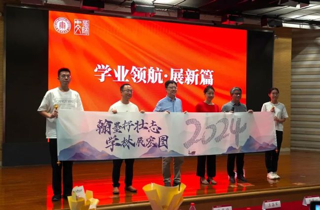 随后,四位老师向2024级全体新生赠送学业启航礼物。卷轴缓缓展开,用中文系全体新生姓名拼成的数字“2024”映入眼帘。翰墨抒壮志,学林展宏图,卷轴寄托着中文系全体教师对新生的美好祝愿。