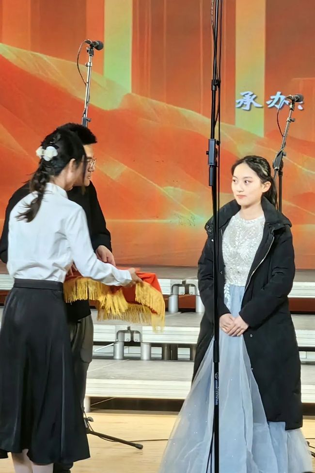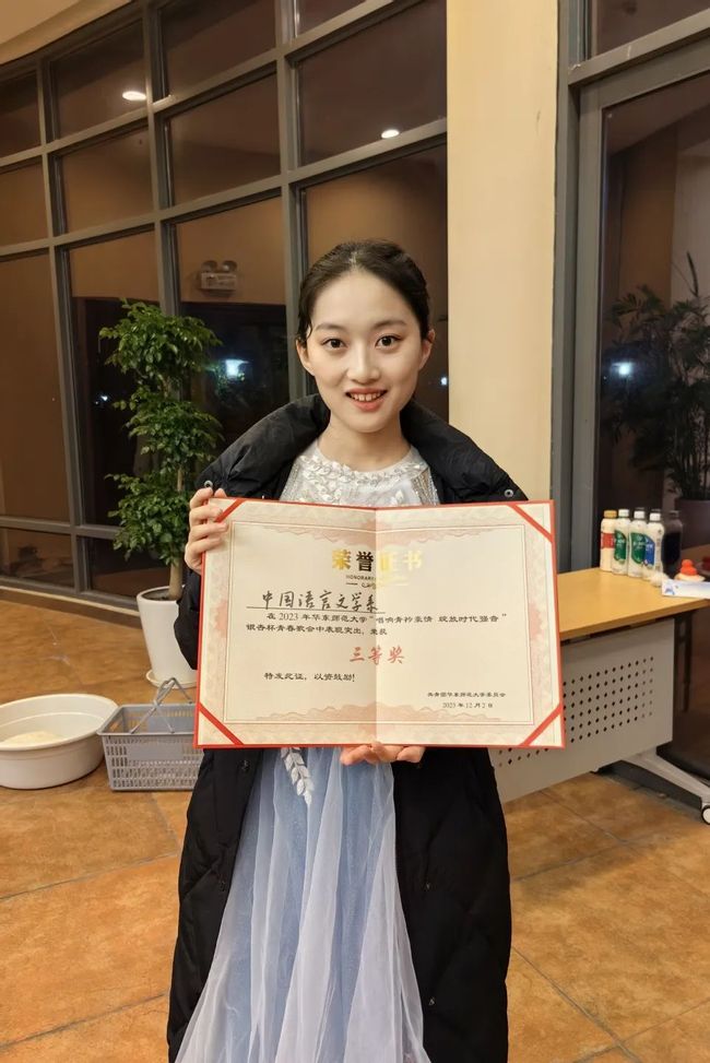 不忘初心,砥砺前行;青春底色,时代强音。中文系合唱团的比赛曲目是《不忘初心》,在2023级靳嘉怡同学的指挥下,25位中文学子深情歌唱,展现出坚定的文化自信和奋进的拳拳之心。最终,凭借精湛的演唱技巧和良好的台风形象,中文系合唱团在诸多队伍中脱颖而出,斩获本届“银杏杯”青春歌会三等奖,赢得了评委老师和观众的声声喝彩。