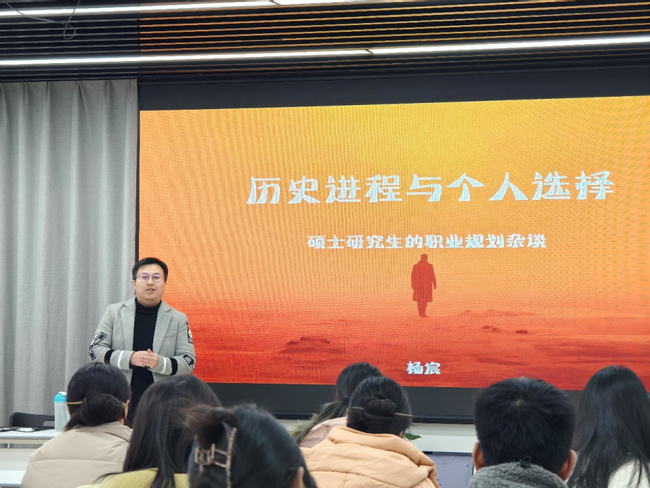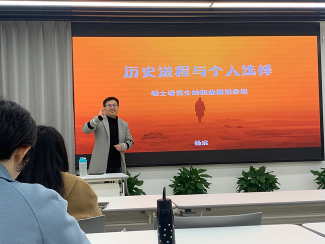 2023年12月13日,中文系学术硕士研究生青年班主任活动在中文系4330报告厅开展。现当代文学教研室的杨宸老师以“历史进程与个人选择——硕士研究生的职业规划杂谈”为题与同学们展开交流,分享自己的生涯规划方面的心得。