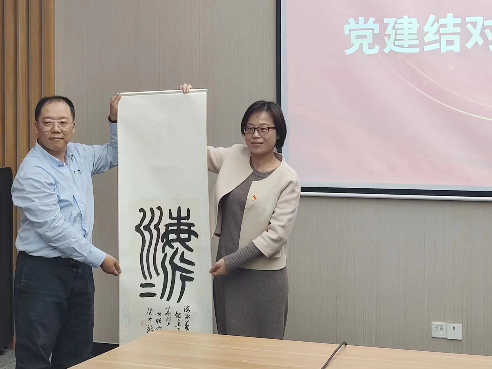 在双方支部成员的共同见证下,中文系行政(辅导员)党支部与闵行区西区文化党支部结对共建协议意向书签约完成。通过支部的深度合作,中文系拟在海派艺术馆建立美育实践基地,通过共建聚合力,传承与弘扬中华优秀传统文化。徐燕婷代表全体支部成员向西区文化党支部赠送了由中文系刘志基教授题写的“海派”书法作品一幅。