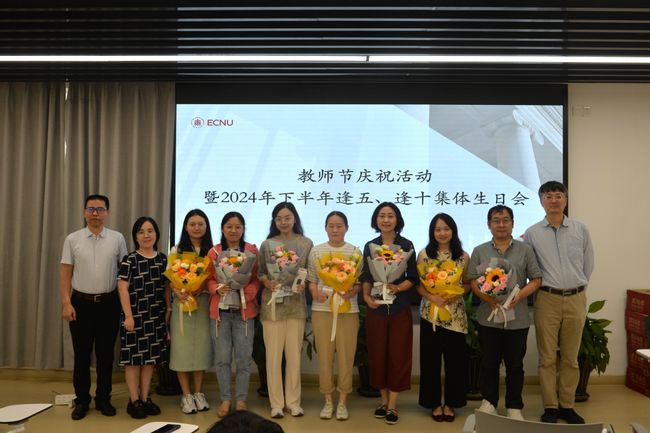 在会上,中文系工会还为今年下半年适逢整五、整十生日的教职工们进行集体庆祝活动。系工会主席韩蕾老师宣读生日名单,系主任文贵良老师、系党委书记徐默凡老师为逢五、逢十生日的教职工送上鲜花、发放纪念品。随后,老师们一起分享蛋糕,分享逢五、逢十生日的喜悦,希望藉此可以让老师们感受到中文系大家庭的温暖,营造积极向上的工作氛围,增强老师们的幸福感和归属感。