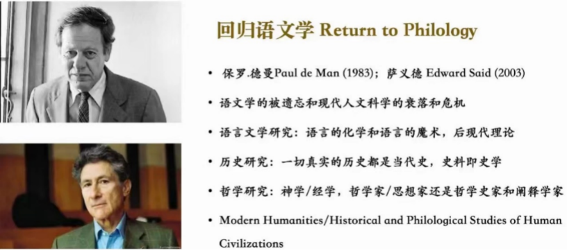 沈老师首先结合了自己丰富的学术经历,说明“为什么我的心在语文学”。沈老师的研究范围包括蒙元史、印藏佛学研究、国学与汉藏佛学研究、语文学等部分。沈老师列举保罗·德曼以及萨义德提出的“语文学的被遗忘和现代人文科学的衰落和危机”,呼吁我们要回归语文学。