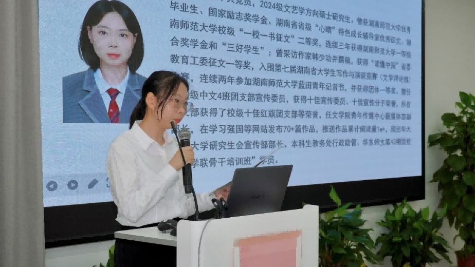 随后,中文系研究生辅导员李思瑶老师致辞,李老师肯定了中文系研会同学以需求为导向的服务意识、以创新为驱动的执行能力、以协作为根基的团队精神,并期待新一届的中文系研究生会能牢记服务初心,传承特色品牌,将组织工作与个人成长相结合,将中文系研究生会建设成既有专业高度又有人文温度的卓越集体。