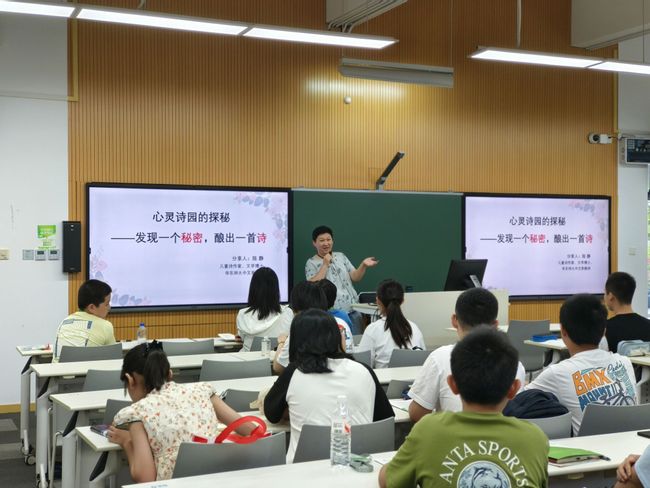 随后,儿童诗作家、 自慰视频 中文系陈静老师主持诗歌创作工坊“心灵诗园的探秘”。学员们不仅更加了解了现代诗歌,也自己动手创作,领会诗歌之美。
