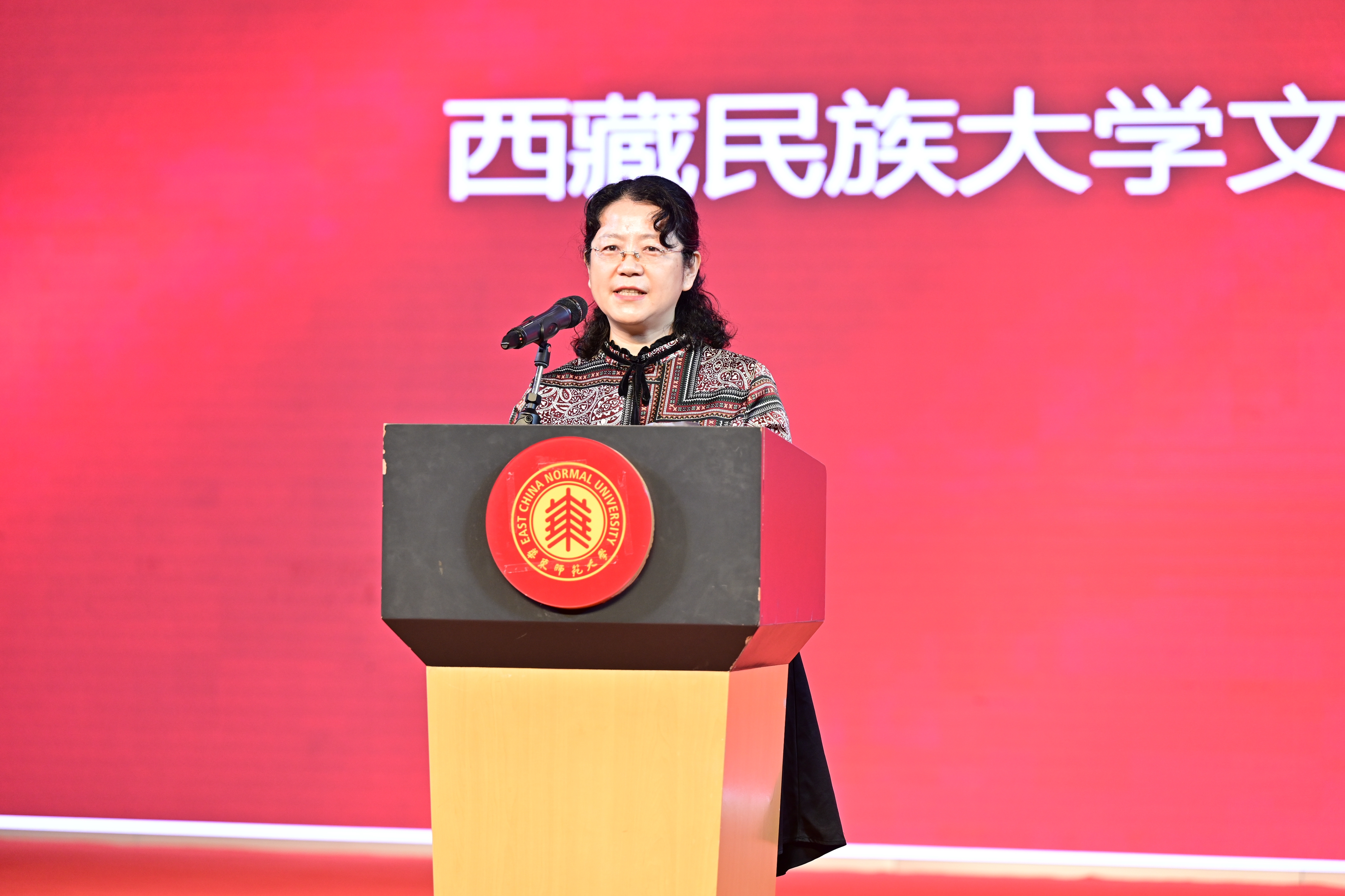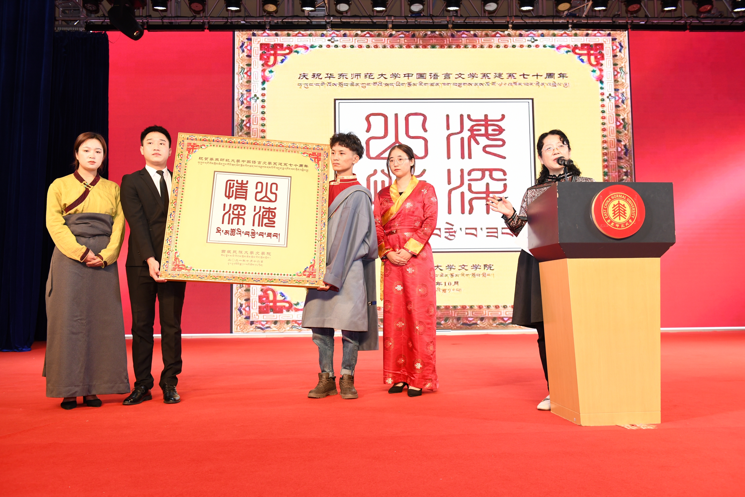 一直以来,华东师大中文系坚守社会使命,以服务国家和区域经济社会发展为目标。作为对口支援学校代表的西藏民族大学文学院党委书记任秀丽在大会上致辞,她表示,自六十年代,在华东师大建校不到十年,中文系建系不到十年的时候,30余名毕业生支援西藏公学,即西藏民族大学的前身,来自中文系等院系的毕业生们为民族教育事业勤奋耕耘,架起了友谊之桥,一直到今天,华东师大中文系与西藏民族大学文学院继续共谱办学新篇章。大会现场,西藏民族大学的同学们还送上了西藏民族大学文学院的贺礼,由藏汉文字书写的“山海情深”。任秀丽书记介绍,字的边框为西藏人民创作的“长城文”,寓意以长城筑牢中华民族共同体意识。