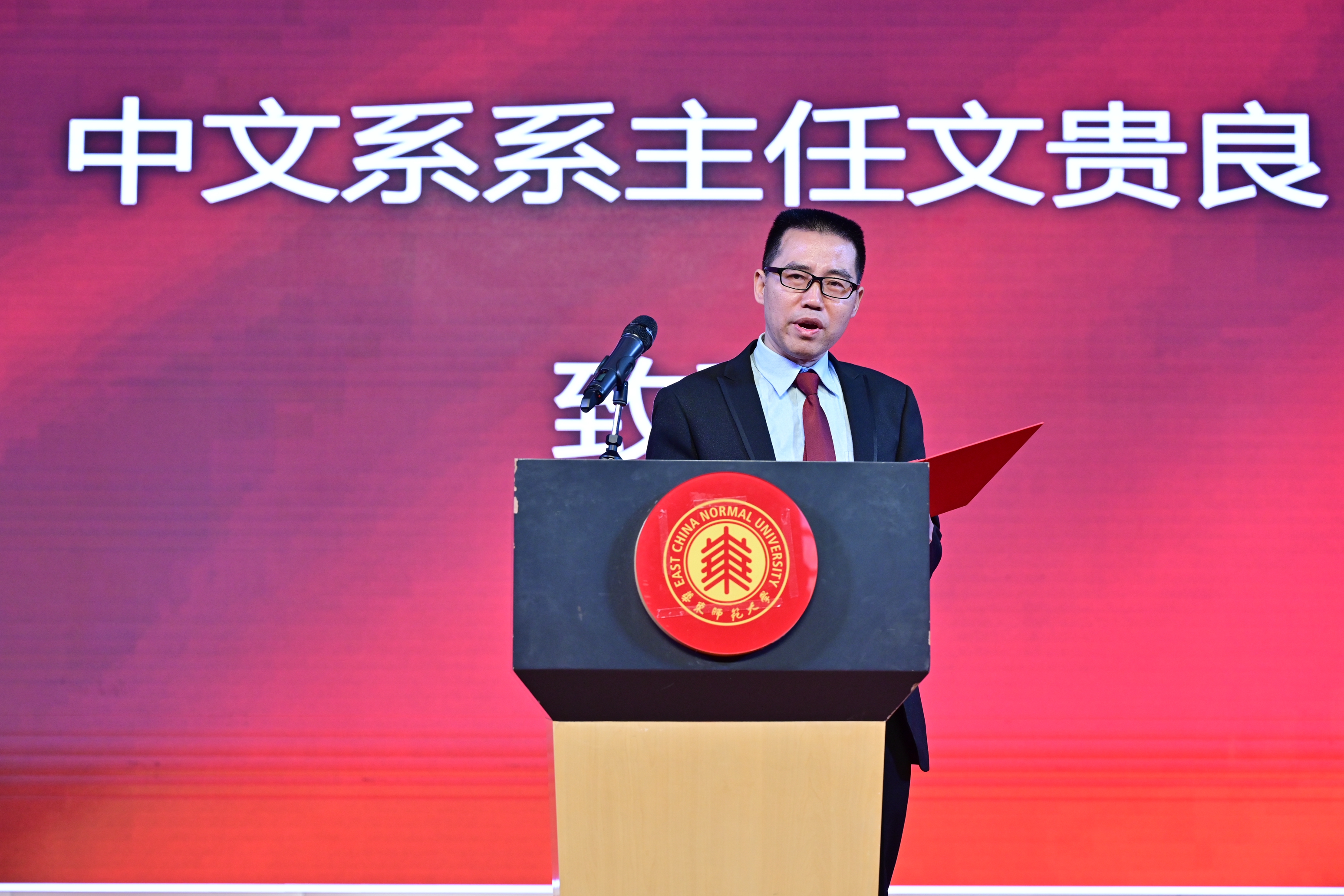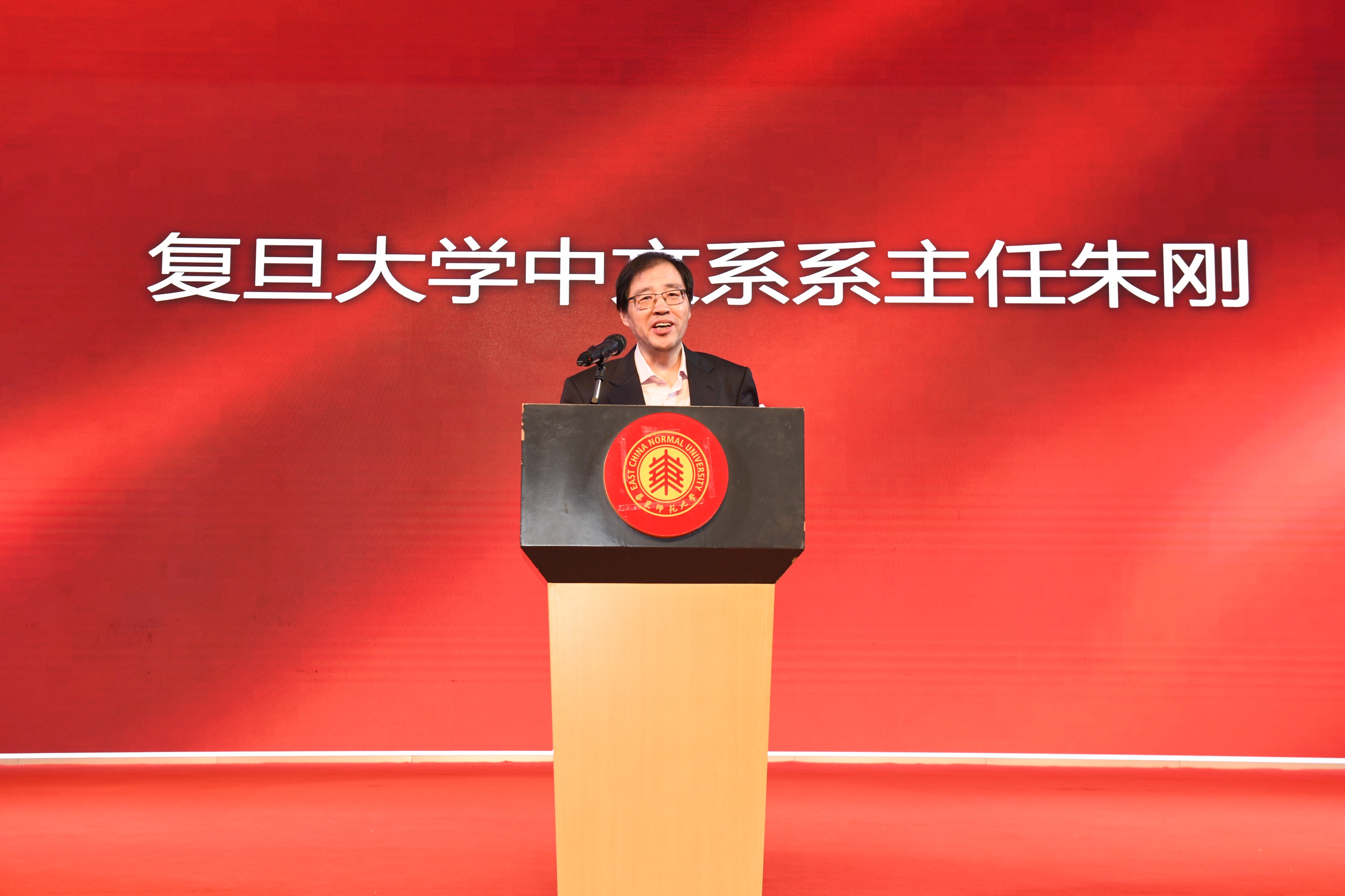 复旦大学中国语言文学系系主任朱刚教授作为兄弟院校的代表致辞,他认为,华东师大中文学科在各个领域都有优秀的学者,完善的人才梯队,高水平的期刊和广泛的社会影响,是各院校学科建设的一个榜样。七十年的发展建设中,华东师大中文系的前辈们以勇气和智慧开拓了前路,取得了令同行瞩目的成就。他代表复旦大学向华东师大中文系前辈付出的辛劳致以崇高敬意,复旦大学与华东师大地处同城,联系紧密,渊源深厚,期待未来两系能继续加强合作,协同共进。