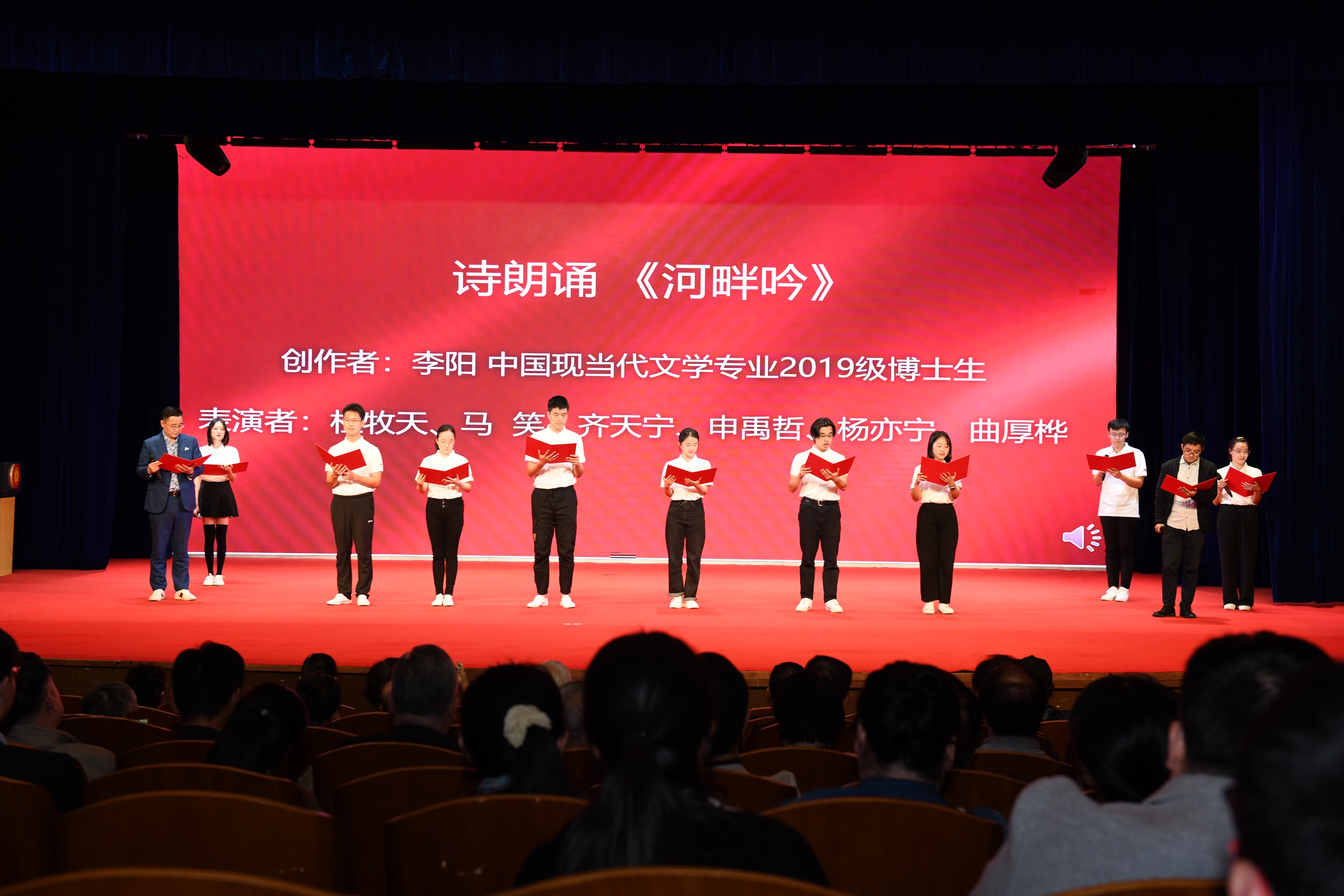 七十春秋,风雨沧桑;七十征途,扬帆竞航。由中国现当代文学专业2019级博士生李阳为本次系庆70周年专门创作的新诗《河畔吟》,表达了青春的心跳与对未来的期许。由分众传媒执行董事、中文系1989级系友嵇海荣,中文系中国现当代文学教研室青年教师孙尧天,中文系中国现当代文学专业2021级博士生董韫玮,中文系创意写作专业2019级硕士生傅王楠,中文系创意写作专业2020级硕士生马笑以及中文系2019级本科生刘天宇共同表演朗诵,歌颂了中文人求实奋进、不断前行的精神。