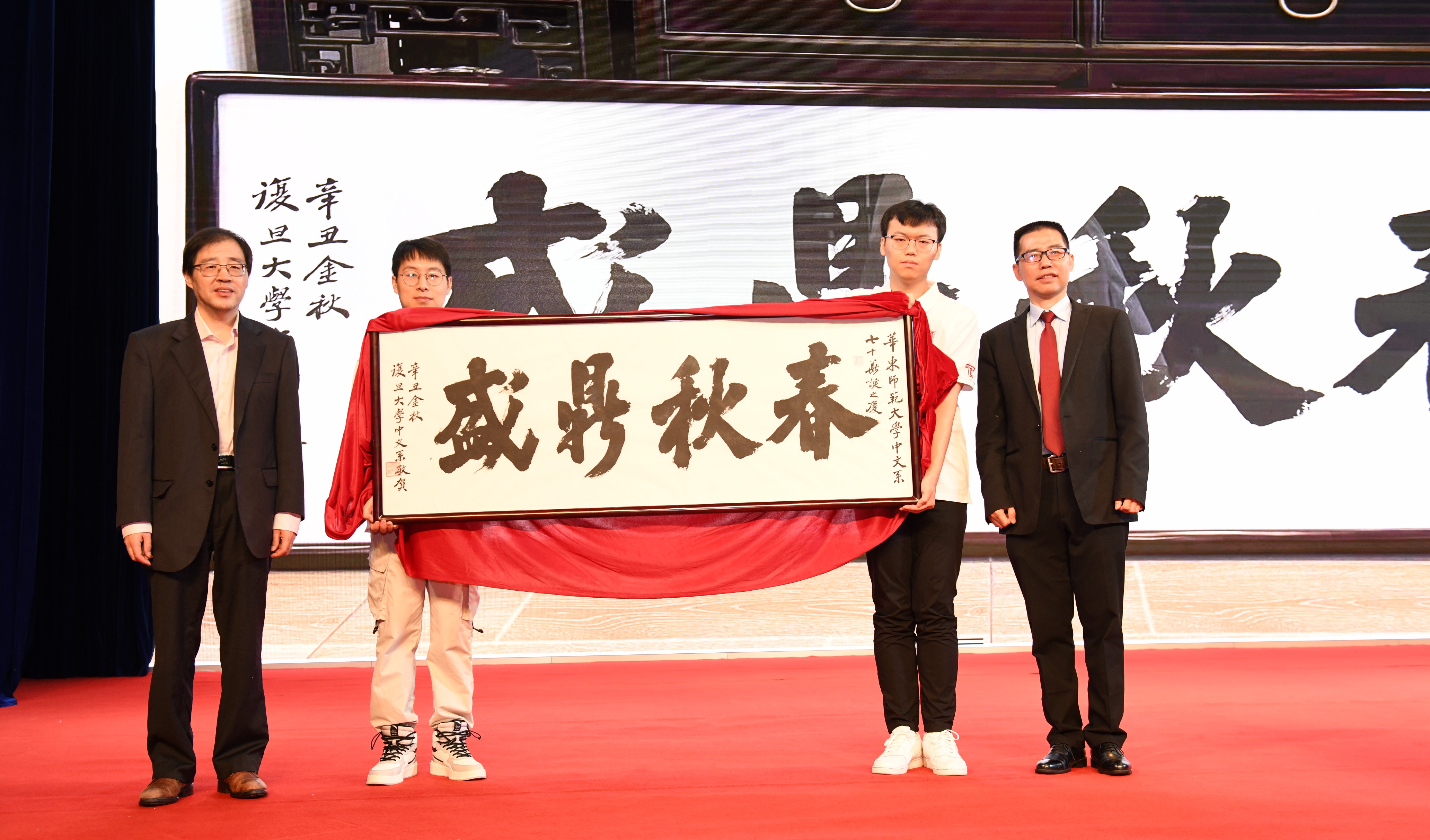 为表达情谊,复旦大学中文系准备了一幅题为“春秋鼎盛”的墨宝,在大会现场由朱刚教授赠予华东师大中文系。
