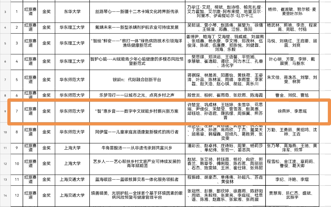 近日,上海市教育委员会公布《中国国际大学生创新大赛2025(上海赛区)获奖名单》,由中文系徐燕婷教授、李思瑶老师指导的项目《“智”惠乡音——数字中文赋能乡村振兴新方案》荣获上海市金奖。继2024年荣膺上海市优胜奖后,我系此番斩获金奖,实现里程碑式突破!