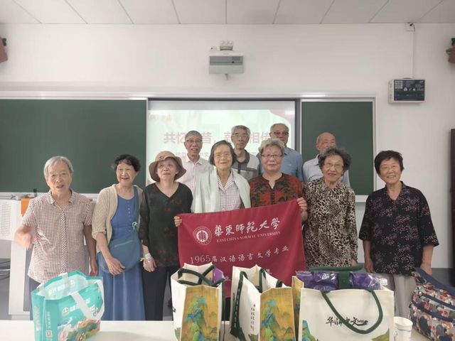 随后,系友们陆续回到当年的教室,重温求学岁月,共叙同窗情谊。65届的“班会”上,校友们紧紧相握的手、时而传出的感叹声、脸上灿烂的笑容,处处显示出同学间深厚的情谊。他们举着写有“毕业六十周年”字样的旗帜,几番合影留念。副校长雷启立及中文系各位领导老师也走进班会现场,对各位校友的到来表示热烈欢迎和诚挚问候。