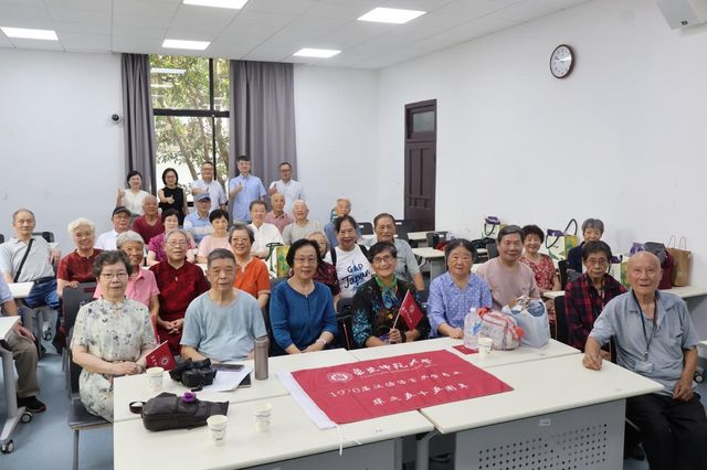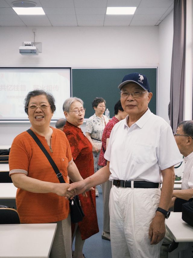 70届校友所在的活动现场气氛十分热烈,每有一位老友走进教室,便响起阵阵掌声。大家互相拥抱致意,而后便聊起了家常,多年未见,似是有说不完的话。
