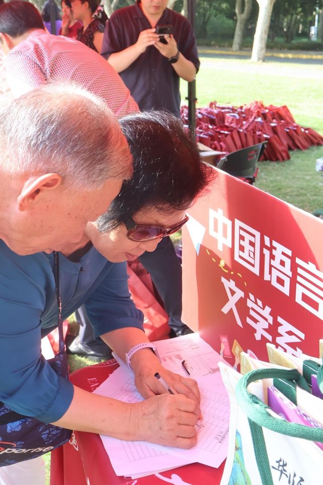 清晨的校园因重逢而沸腾,签到处笑语盈盈、拥抱不断。系友们陆续领取了中文系精心准备的定制帆布袋,以及校友会发放的文化衫、校徽、校旗等纪念品。他们纷纷邀昔日同窗合影,在镜头中定格灿烂笑容,将这一刻的情谊永恒珍藏。