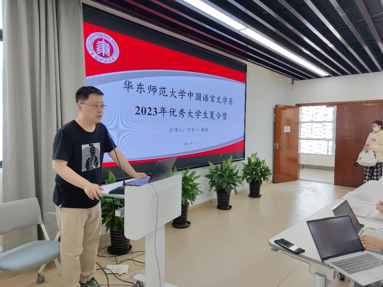 文贵良教授致辞开幕式上,文贵良教授“以38度的热情”感谢各位学子选择和参加华东师大中文系夏令营,并向营员们简单介绍中文系的发展历史和前辈学者。文老师阐述了中文系的学术传统:固本开放 、厚重灵动,以及文学传统,即:情怀社会与关注当下。随后,他从几个方面介绍了中文系研究生的人才培养方案。一方面,中文系注重夯实基础,设立了必读书目考试,以期促进学生多读书、善读书;另一方面也积极支持海外学者访学,扩大学生的国际视野。华东师大与日本早稻田大学、德国哥廷根大学、巴黎东方语言文化学院等海外名校都有合作,每年会选拔同学出国交流。中文系学术氛围自由,学生可以自行组织读书会、自由选择讨论的主题;在学业方面,毕业并不死板地要求发表文章,而是更加注重基础知识的夯实与人文素养的培养。最后,他希望营员们能在夏令营中充分展示自己的才华和学识,也能彼此建立深厚的友谊。开营式结束后,中国现当代文学教研室的倪文尖教授给营员们作了第一场讲座:《从汪曾祺的感叹号说起》。倪老师将文本细读细化到标点符号的层面,比较了汪曾祺《昆明的雨》、余秋雨《道士塔》、朱自清《背影》、茅盾《白杨礼赞》四篇散文中感叹号的使用情况,凸显了汪曾祺使用感叹号的特点。在《昆明的雨》中,作家写回忆对象“雨”时,不用感叹号,而描写所忆的具体内容如杨梅时,多用感叹号,由此分析《昆明的雨》中存在的“现在时态”和“过去时态”,揭示了汪曾祺回忆性散文中两种时态嵌套的结构。讲座获得了营员们的热烈反响,在提问环节,不少营员就讲座中提到的问题,当场向倪老师请教。倪老师一一解答,提醒营员注意学术研究的过程中要学会重视反例,学会做减法,学会提出质疑,这样才能带来深度。第二场讲座由文艺学教研室刘阳教授主讲,主题为《艺术创造中的若干谜题》。刘阳老师结合语言论转向以来哲学思潮的转变背景,引导同学们细致探讨艺术创造的精微奥秘,为使讲座适应各专业的同学,老师从具身感知的维度,以设问为前提,邀请同学们现场观摩丰富的古今中外艺术作品,通过引导性设问将同学们带入讲座的核心话题:“一件艺术作品究竟是如何创造出来的?主体视点和语言在这一过程中处于何种位置?”刘老师分析了不同观看方式形成的潜在估计,其后从正反两面切入,厘清对估计的修正与试验属于真实还是错觉的问题,并通过对创作过程中时间与逻辑观测结果所形成的认知差异,提醒同学们注意艺术中自控兼容受控的活动和过程,从而导出常规与反常规意义上审美的事件性实质。讲座结束之后,刘阳老师还加入了夏令营营员群,跟营员们继续交流答疑。7月6日晚,夏令营专业介绍与政策咨询介绍会在人文楼4430会议室举行,中文系研究生教学秘书吴晗担任主持。中文系副系主任方笑一、汤拥华教授、系主任助理王耐刚副教授和创意写作研究生教学秘书叶杨莉老师出席该活动。会上,方笑一教授首先对中文系的建系历史、师资队伍、学术平台、研究生培养与课程设计作全方位的介绍。汤拥华教授从自己博士求学说起,聊到与其他青年老师的结识、交游等经历,进一步分享自己到华东师大求学的感受,并寄愿同学们能够“有勇气和热情去追求美好的事物”。王耐刚副教授介绍了中文系中国古典文献学的学科历史和培养方案,鼓励同学们勇于开拓自己的边界,寻找自己热爱的就业方向。随后,中文系研究生教学秘书吴晗与创意写作研究生秘书叶杨莉主持答疑环节,现场解答营员们关于中文系研究生学习的相关问题。7月7日,中文系各教研室对营员们进行了专业面试,通过专业知识、英语口语能力等多方面的考察,选拔出的45名优秀营员将获得预录取资格。专业面试结束后,为期两日的夏令营活动就此落下帷幕。通过夏令营活动,来自全国各地的学子们切身感受了华东师大中文系独特的人文底蕴和名师风采。华东师大中文系的大门将永远为怀揣热诚的学子们敞开。