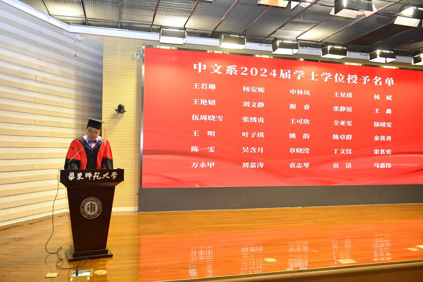 出席本次典礼的有中文系系主任文贵良,人文与社会科学学院院长、中文系古代汉语教研室教师吕志峰,中文系党委书记徐默凡,中文系副系主任方笑一、汤拥华、王嘉军,中文系党委副书记徐燕婷,教师代表、中文系文艺学教研室教师刘晓丽,系主任助理徐俪成。本次典礼还邀请到了著名作家、上海市作协副主席赵丽宏先生作为校友代表出席活动。全体毕业班辅导员和中文系2024届毕业生共同参与典礼。