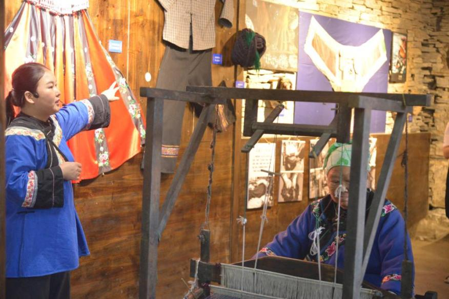 我们首先参观的是苗家非遗织布坊和竹山苗绣堂。在传统的苗族民居中,观看苗家阿妈织土布的场景,深入了解苗族的纺织工艺、服饰特色与刺绣文化。苗族男性服饰简朴大方,以蓝黑为主色调,女性服饰则颜色鲜艳、绣花繁多。作为有语无文的民族,苗族铭记历史的方式由“阿妈一针一线绣在身上”:为纪念族群发源地河南洛阳,女性衣裙纹样多绣牡丹,未出嫁女子衣裙则绣荷花,象征出淤泥而不染的美好品质。苗服将刺绣与银饰相结合,形成以大为美、以多为美、以重为美的审美特色。