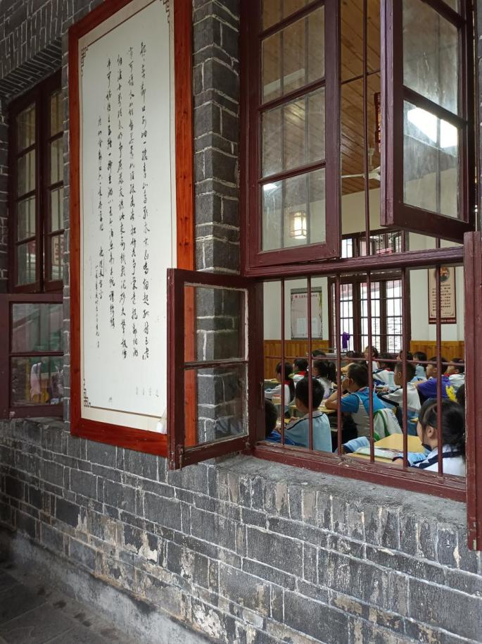 上课铃响了,我们走过一座小桥,来到了一间特殊的教室:沈从文、黄永玉、肖纪美小时候读过书的教室。孩子们正跟着老师大声朗读英语,窗外的大树苍翠劲拔,谁能想到,当年沈从文就在这个院子里被先生罚跪过呢?